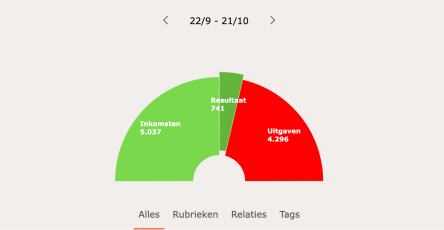 De app categoriseert je uitgaven grotendeels automatisch, zodat je in één oogopslag kunt zien hoeveel je hebt uitgegeven aan bijvoorbeeld boodschappen, abonnementen, of vrijetijdsbesteding. Je krijgt ook grafieken en rapporten die je helpen te begrijpen waar je geld naartoe gaat. - Budgetfunctie