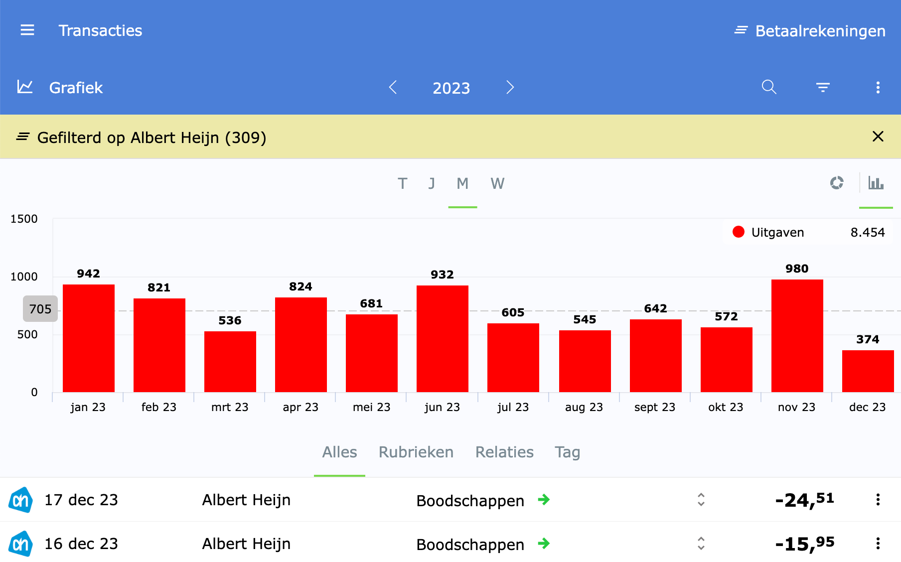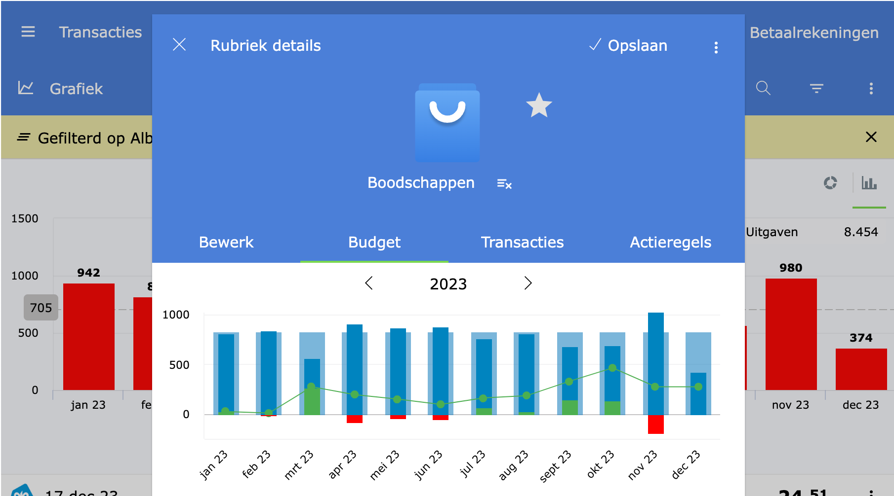 Na het instellen van een budget zie je hoe je loopt ten opzichte van het budget als de “positie”. Geef je minder uit dan het ingestelde budget dan wordt dat weergegeven als positieve positie. Geef je meer uit dan is dat zichtbaar als negatieve positie.
