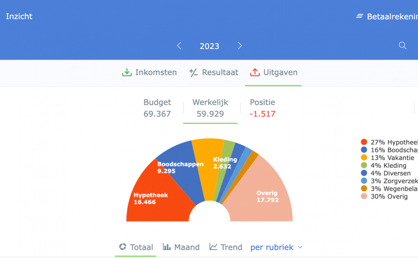 Ontdek waar je geld naartoe gaat, hoe je uitgaven zich verhouden tot je budget en wat je aan het einde van het jaar overhoudt. De inzicht weergave in Spendle toont het resultaat en houdt daarbij rekening met uitsluitingen zoals onderlinge boekingen, bijvoorbeeld spaartransacties.