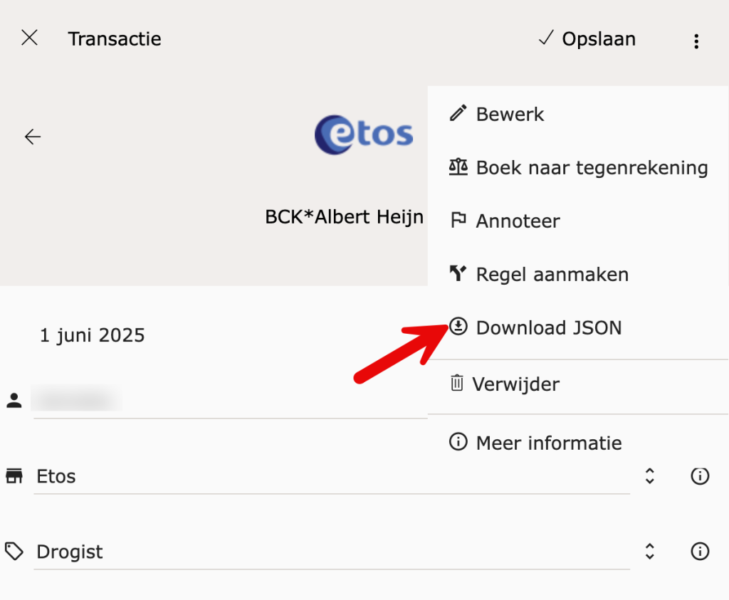 Je kunt deze bestanden downloaden door op de betreffende transactie te klikken en vervolgens via het menu rechtsboven te kiezen voor “Download JSON”.