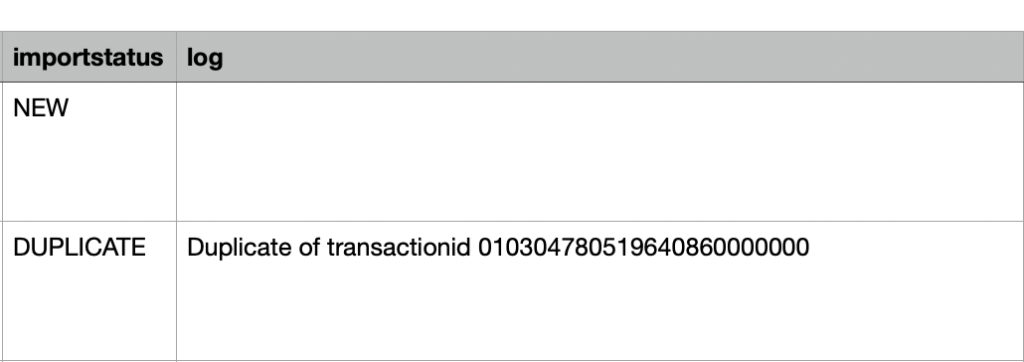 Controleer in de kolom importStatus of Spendle de transactie als NEW (nieuw) of DUPLICATE (dubbel) heeft gemarkeerd.