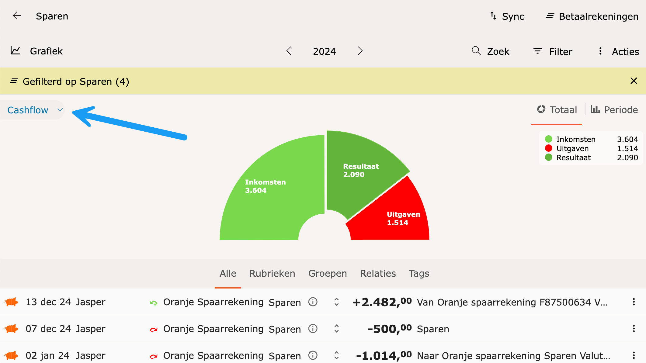 Instelbare grafieken in het transactiescherm. De weergave van de grafiek in het transactiescherm is nu aan te passen. Je kunt kiezen tussen “Cashflow” en “Resultaat”. Dit biedt meer flexibiliteit bij het analyseren van je onderlinge boekingen zoals Sparen. Zie ook Salderen en onderlinge boekingen.