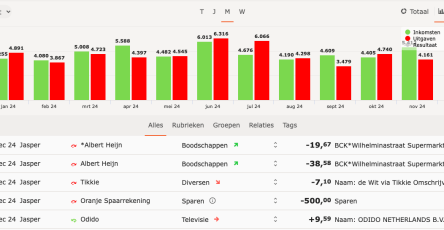 Instelbare grafieken in het transactiescherm. De weergave van de grafiek in het transactiescherm is nu aan te passen. Je kunt kiezen tussen “Cashflow” en “Resultaat”. Dit biedt meer flexibiliteit bij het analyseren van je onderlinge boekingen zoals Sparen. Zie ook Salderen en onderlinge boekingen.